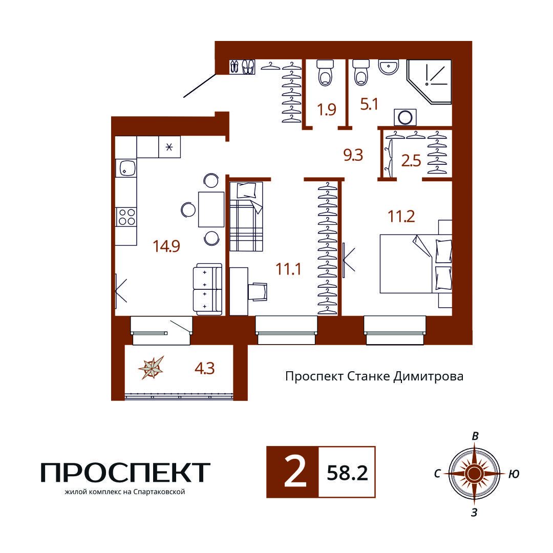 | 2-комнатная | 58.9 | 2-9 | 109500109 500 | 64495506 449 550 |