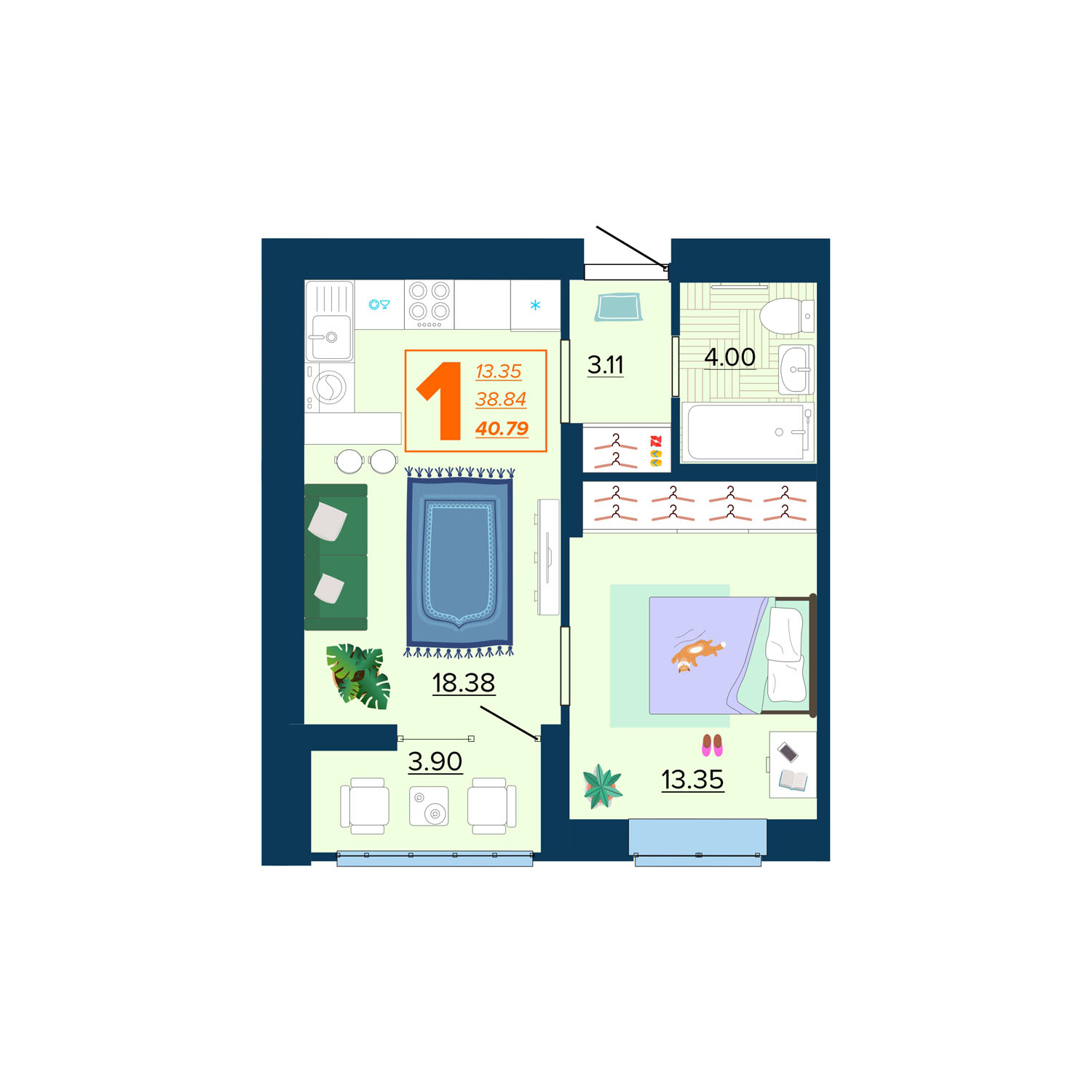 1-комнатная квартира, 40.79 м2