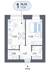 1-комнатная квартира, 35.92 м2