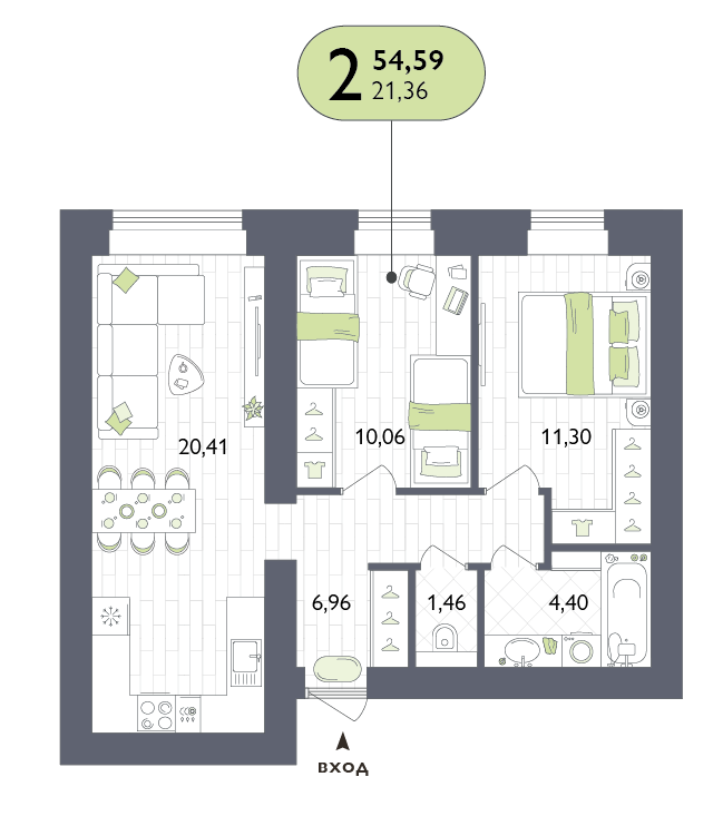 2-комнатная квартира, 54.59 м2