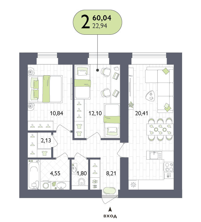 2-комнатная квартира, 60.04 м2