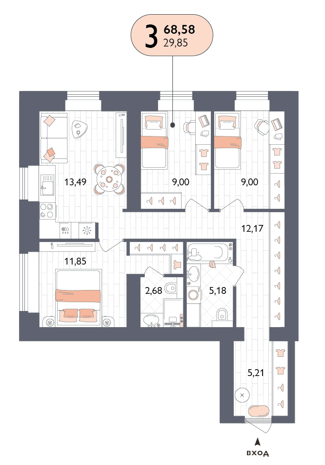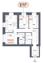 3-комнатная квартира, 68.58 м2